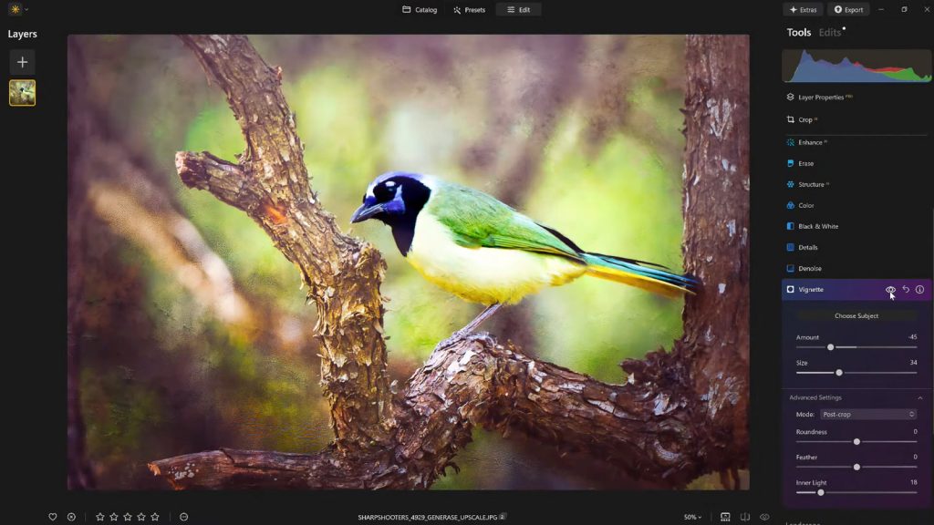 Once color adjustments are complete, a vignette can subtly draw attention toward the subject. The composition naturally pulls the viewer inward by darkening the edges and adding a touch of Inner Light in the center. This creates a visual spotlight that enhances focus without heavy masking or local adjustments.
